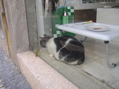 Em Évora parece moda deixar os animais nas lojas. Este gato tinha como companhia um gafanhoto, apenas o vidro os separa!
