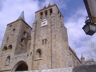 edieval do país, e um incomparável exemplar da arquitectura de transição romano-gótica. A um primitivo templo construído entre 1186 e os primeiros anos do século XIII, sucedeu-se o grandioso monumento que hoje existe, resultado essencialmente de duas notáveis campanhas da Baixa Idade Média. Tem planta de estilo românico, com estrutura e decoração góticas, estilo bem visível nas abóbadas e nos arcos ogivais. O portal é um dos mais impressionantes exemplares góticos portugueses. É ladeado por estátuas dos apóstolos, da autoria de Mestre Pêro, também autor das esculturas do claustro e da capela do fundador, espaço funerário do bispo D. Pedro IV, encomendador destes trabalhos. É ainda de realçar a Capela de Nossa Senhora da Piedade, ou do Esporão, do século XVI, com portal tardo-manuelino de mármore e retábulo maneirista. O coro alto, também do século XVI, conserva o cadeiral renascença e um orgão da mesma época e estilo.De destacar também a torre-lanterna, com corpo de planta octogonal, encimado por janelas góticas e coroado por uma agulha coberta de escamas de pedra. A Sé inclui um Museu de Arte Sacra com um riquíssimo espólio nos domínios da paramentaria, pintura, escultura e ourivesaria.