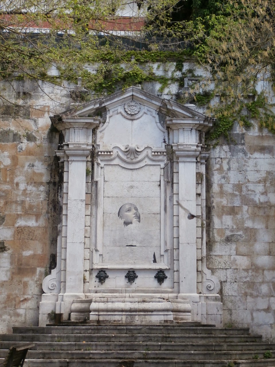 cromática do calcário amarelado do chafariz e da praça, três carrancas